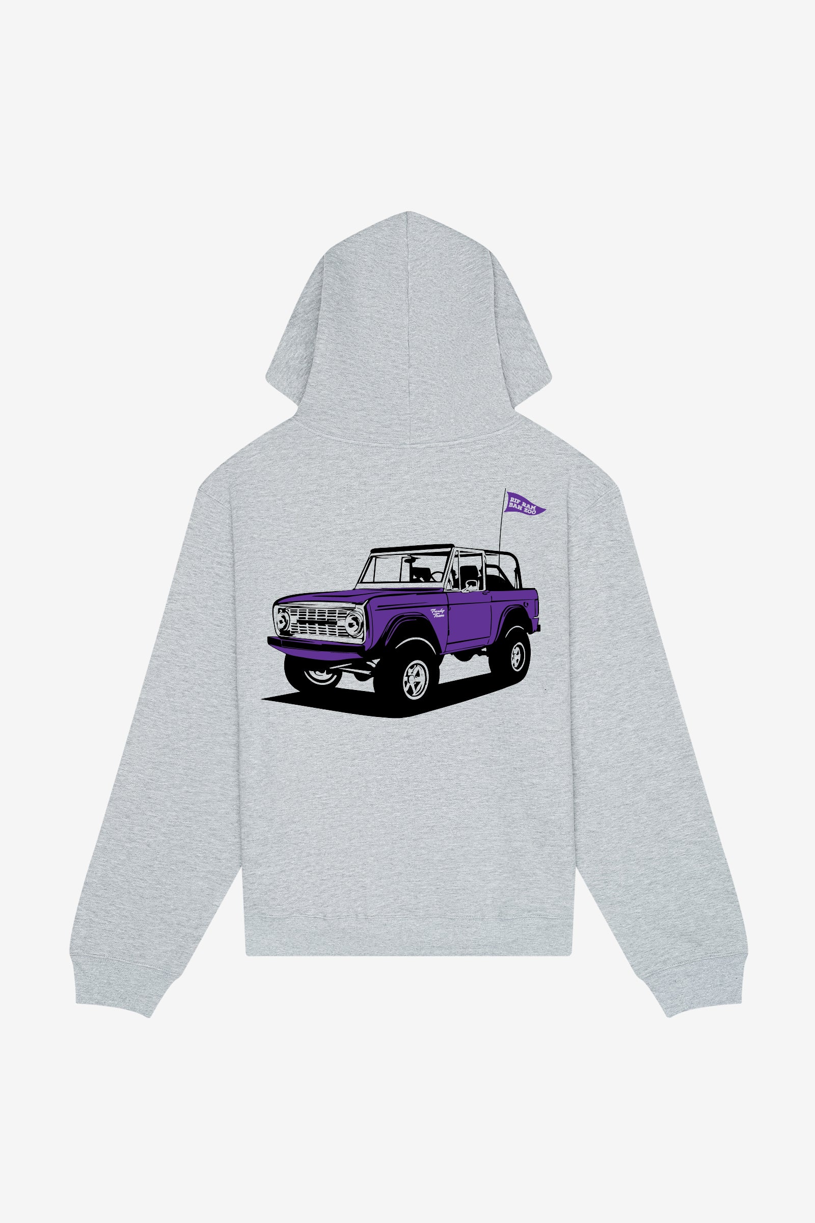 Small, full-color flag graphic on front left chest; large, full-color Bronco graphic on back