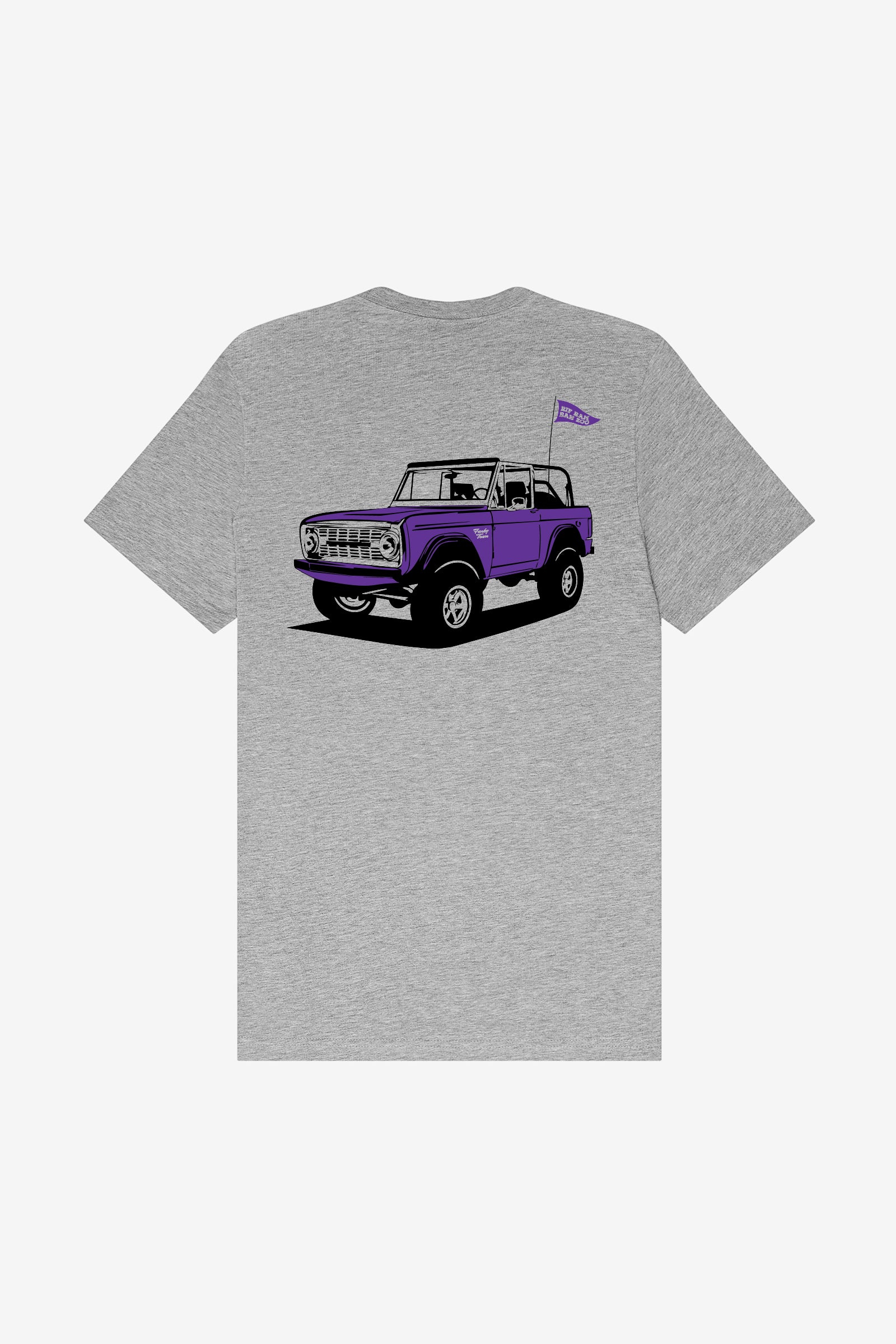 Small, full-color flag graphic on front left chest; large, full-color Bronco graphic on back