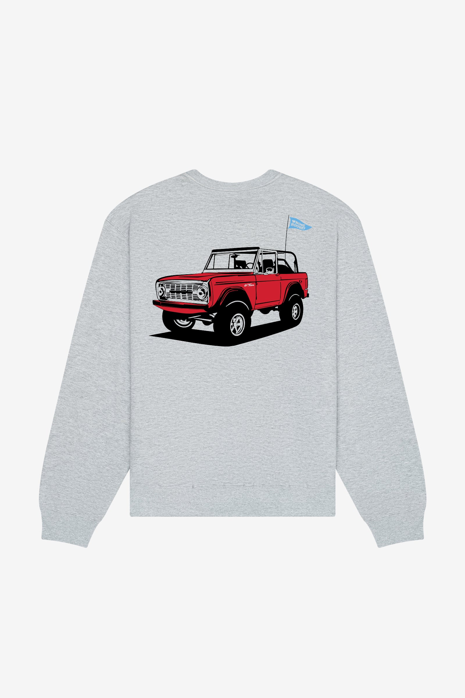 Small, full-color flag graphic on front left chest; large, full-color Bronco graphic on back