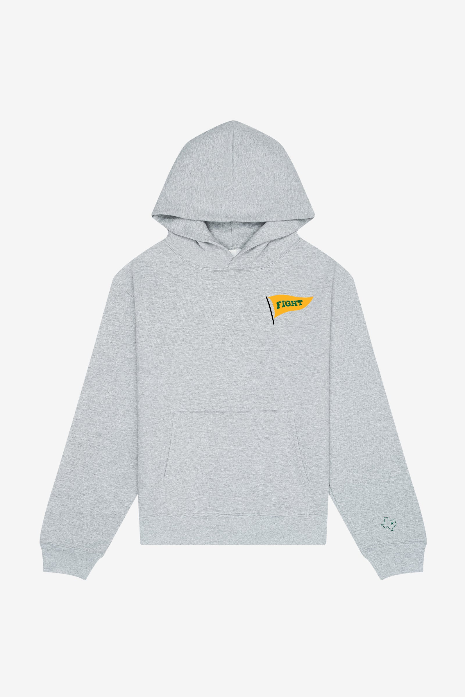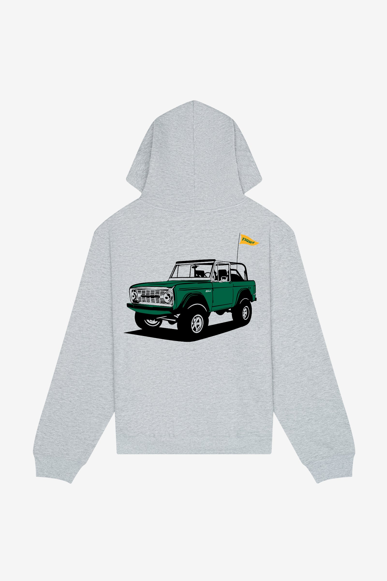 Small, full-color flag graphic on front left chest; large, full-color Bronco graphic on back
